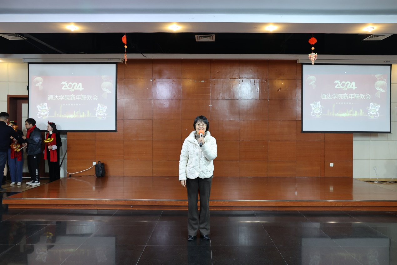 学院党委书记赵允玉代表学院领导班子致新年贺辞,向全体教职工致以节日的祝福。她简单回顾了学院在2023年里取得的突出成绩,对全体教职工对学院发展付出的努力表示感谢!在这一年里,党的组织建设扎扎实实,专业和课程建设、创新创业教育、基础设施建设、后勤服务等方面都取得了很大的成绩。她指出,2023年是全面贯彻党的二十大精神的开局之年,是学校第四次党代会召开之年。希望通达人同心协力、勇于担当,创造更好的明天!预祝大家新年快乐!祝愿通达越来越好!