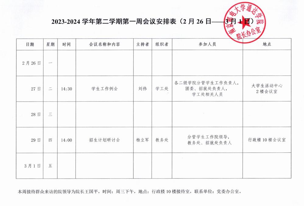 2023-2024学年第二学期第一周会议安排表