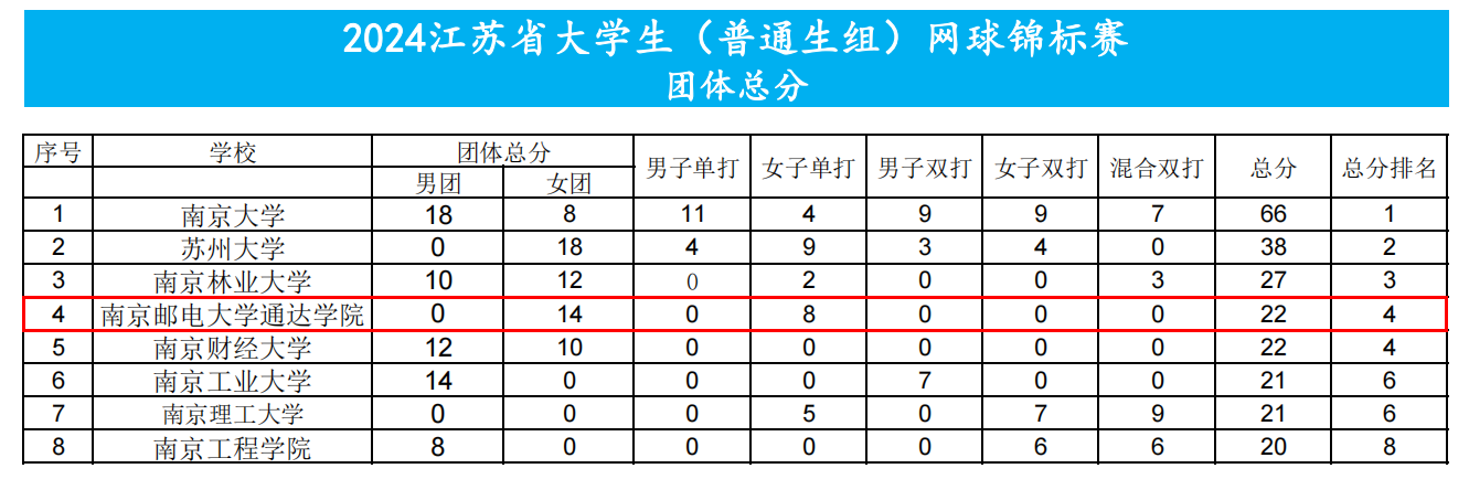 江苏省大学生(普通生组)网球锦标赛团体总分排名前八代表队