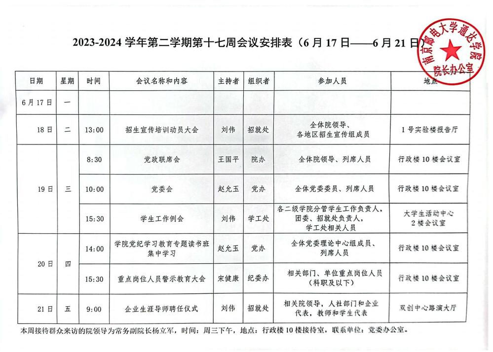 2023-2024学年第二学期第十七周会议安排表