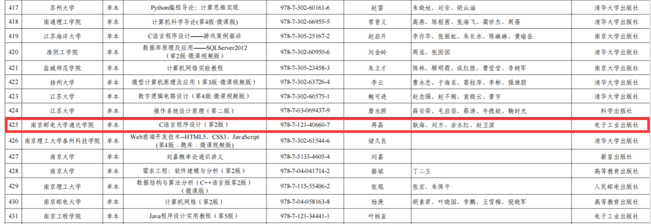 近日,省教育厅公布了江苏“十四五”普通高等教育本科省级规划教材名单,完美官网推荐申报的《C语言程序设计(第2版)》成功入选。