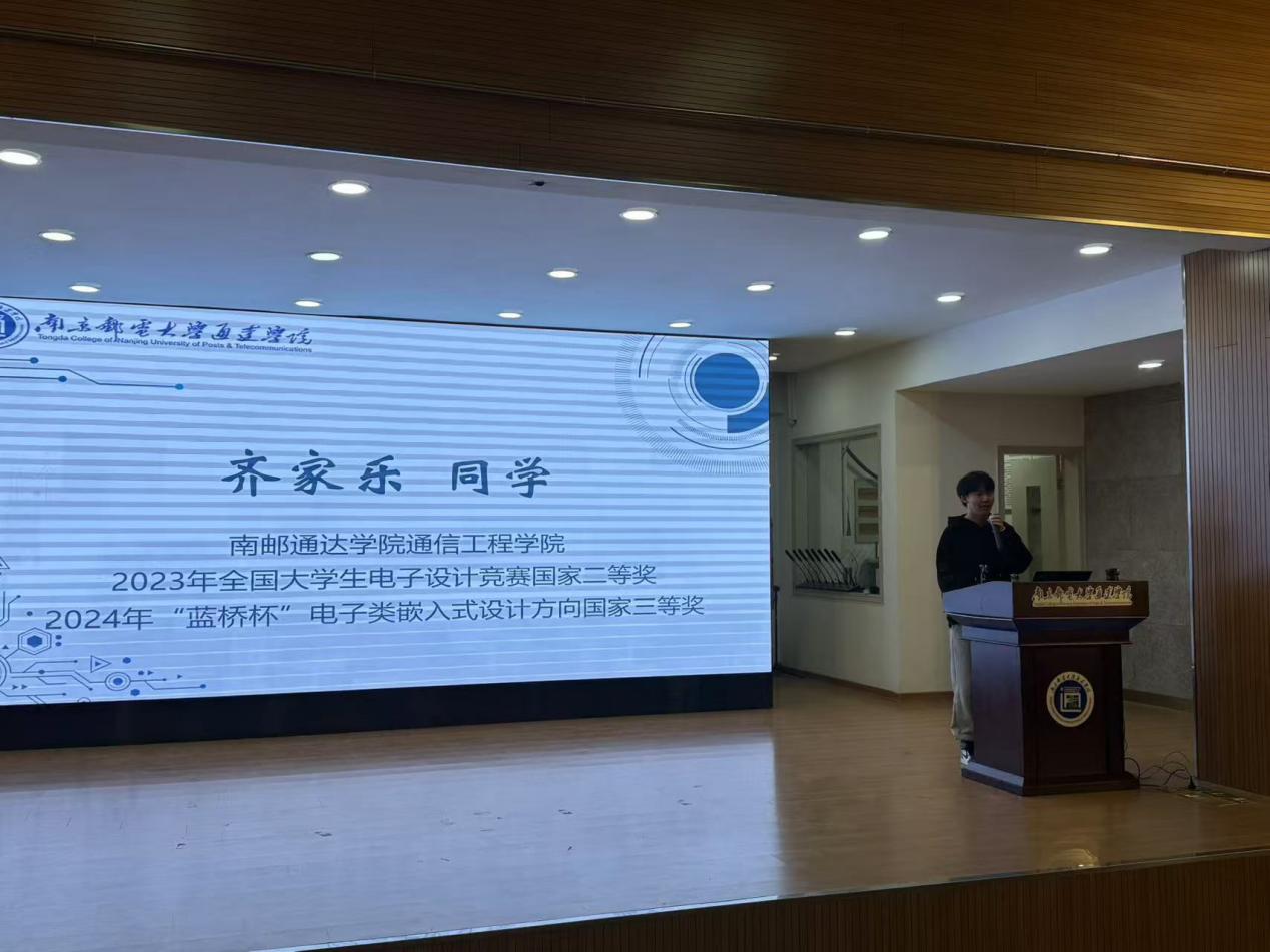 最后,通信工程学院的齐家乐同学作为学生代表,分享了他在电子设计竞赛中的亲身经历与心得体会。齐同学通过自身从大一刚开始接触电赛到大二参加电赛并最终获奖的真实参赛经验,向同学们展示了备赛过程中的困难与挑战,也分享了如何在困境中寻找解决方案,保持团队合作与坚持不懈的重要性。