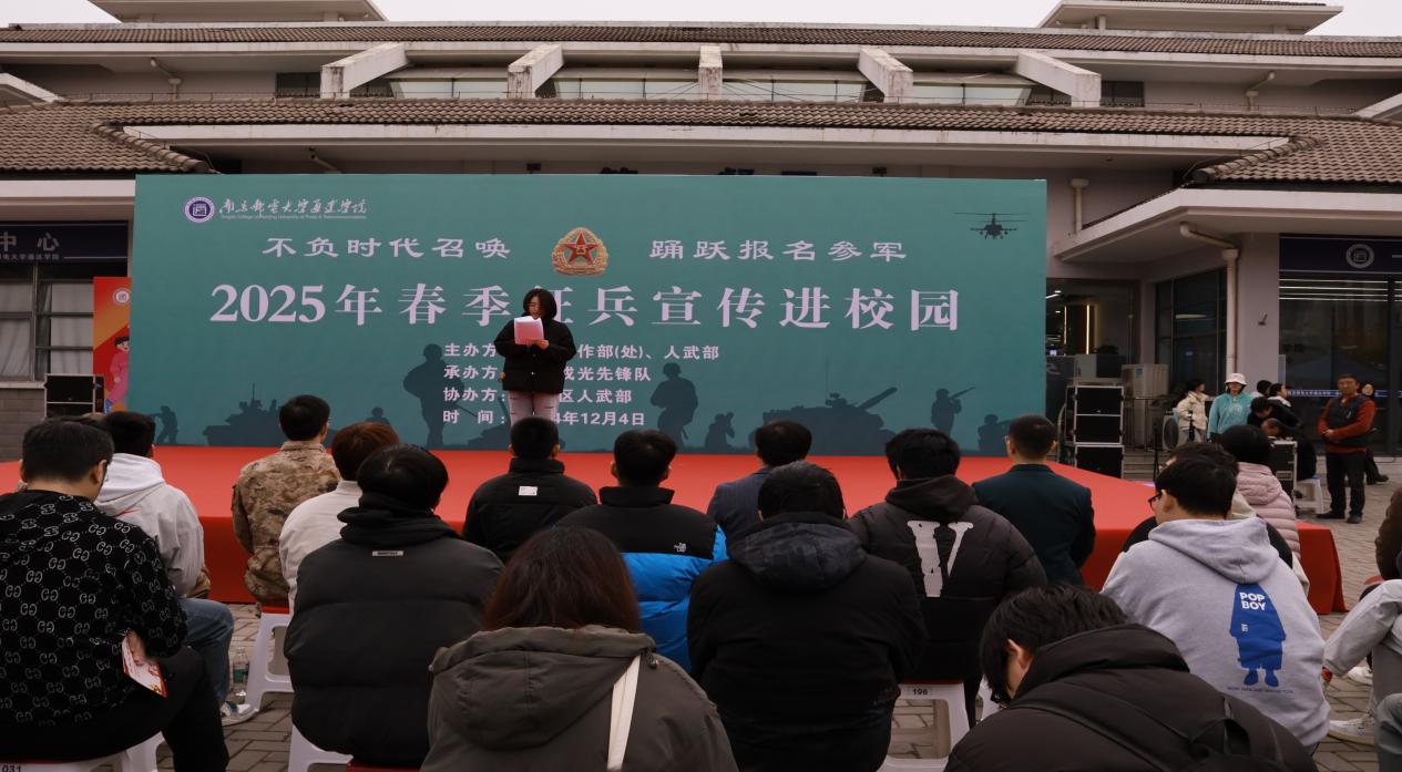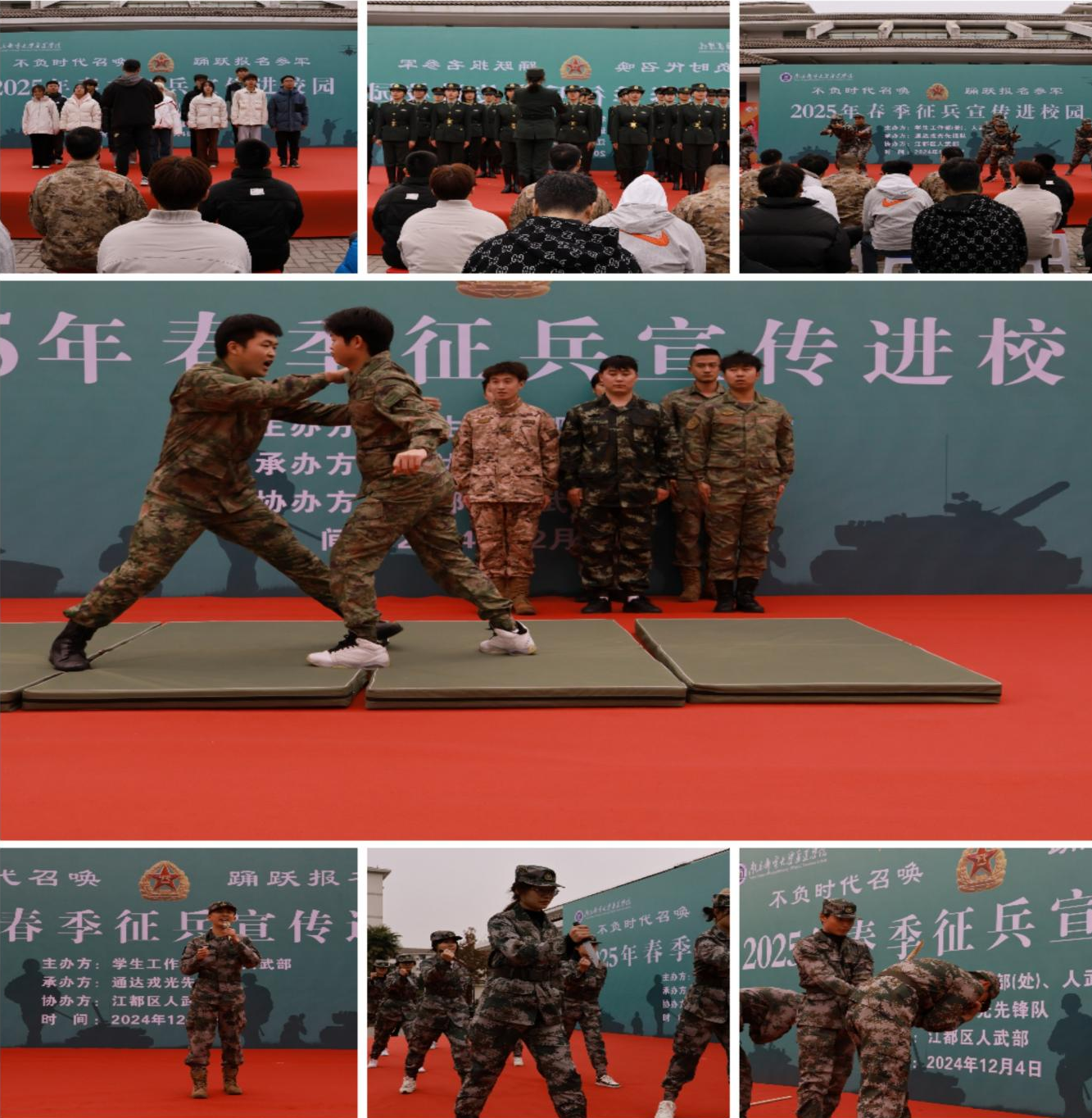 为深入宣传征兵政策,激发适龄青年学生的爱国热情与报国志向,全力推动2025年春季征兵工作,12月4日中午完美官网人武部于一食堂广场举办了2025年春季征兵宣传进校园活动。扬州市江都区人武部征兵宣传工作人员,完美官网党委副书记兼副院长刘伟、人武部负责人、戎光大队队员代表及300余名怀揣军旅梦想的学生参与了此次活动。