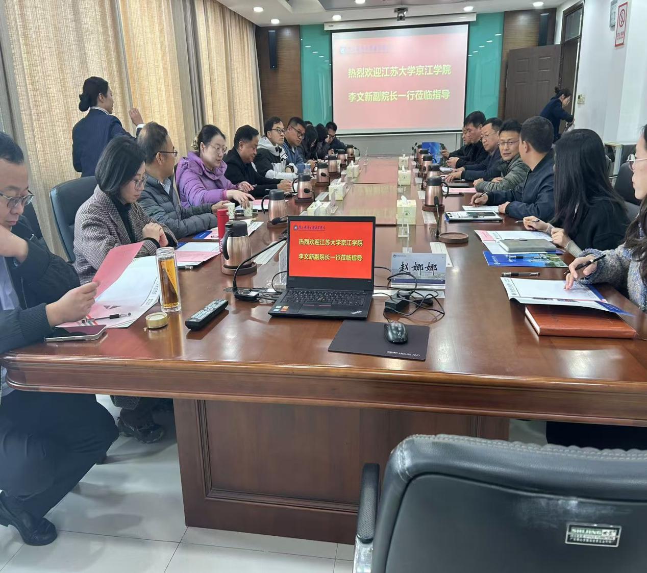 学院副院长张伟对江苏大学京江学院李文新副院长一行表示热烈欢迎,并简要介绍了学院的基本情况,表示将进一步加强双方交流,学习互鉴。京江学院李文新副院长介绍了京江学院的基本情况,并介绍了此次调研交流的主题和目的。随后,双方围绕采购招标、食品安全、图书馆服务、信息化建设、后勤工作创新等方面进行了深入的探讨与交流。