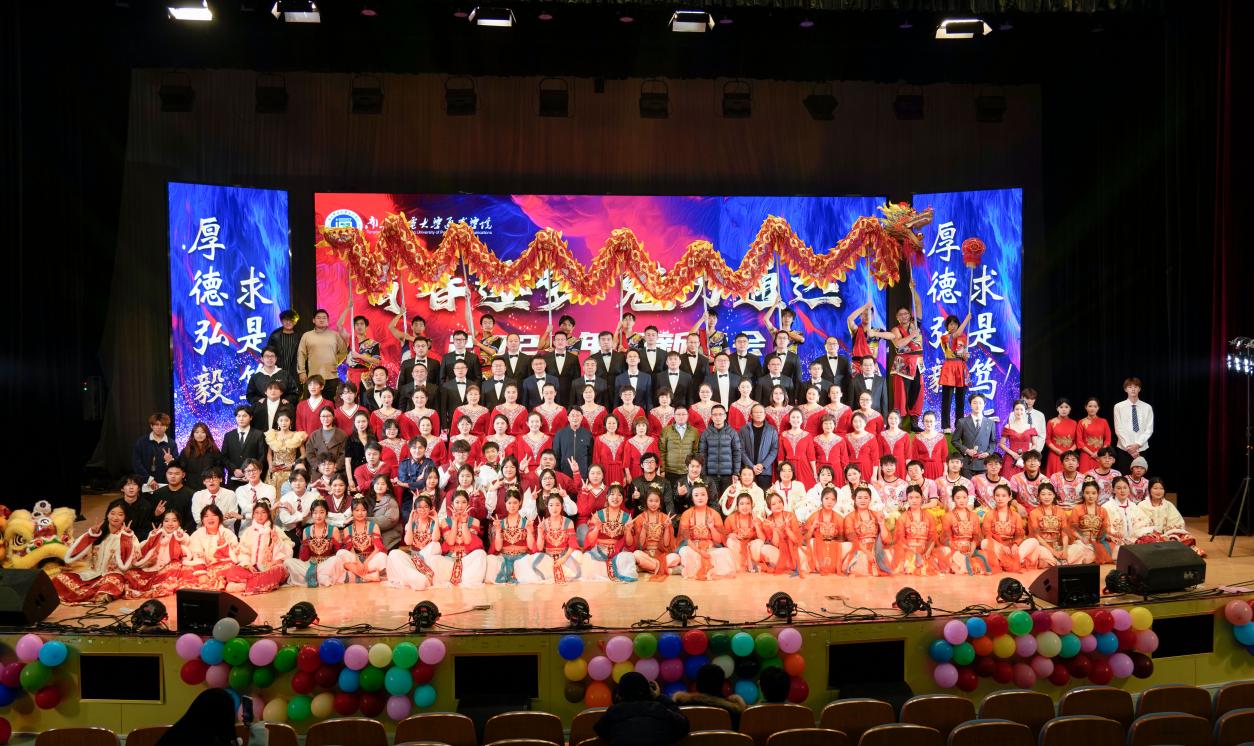 暖场视频《你好,通达》拉开了晚会的帷幕。南邮龙狮舞《龙腾华夏》铿锵有力的锣鼓声和神气活现的龙狮瞬间点燃了观众的热情。歌曲《第一天》展现了完美官网学子积极向上、乐观面对生活的态度。舞蹈《丝路芳华》《rock and rock》及《summer dream》令人目不转睛。手语操《国家》、小品《和平饭店》、歌曲《有我》和《我爱你中国》激励着当代青年矢志不渝、赤胆忠心的爱国情怀。歌曲《一路生花》和短视频《前行》表达了青年学子对未来生活的美好向往。24级新生辅导员带来了暖心的歌曲串烧和情真意切的寄语。邮韵之声教工合唱团饱含爱意的合唱《天耀中华》将晚会推向了最高潮,歌声雄浑有力,歌词中饱含的期许与盼望,彰显着通达教师对新生的谆谆教导与美好祝福,令台下同学深受触动。晚会在师生大合唱南邮校歌《信达天下》中落下帷幕。