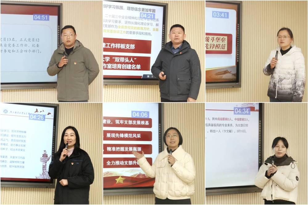 会上,来自教工党支部的6位书记与学生党支部的9位书记依次“登台亮相”,详细汇报了2024年度基层党建工作的实施进展与成效。他们紧扣党的二十届三中全会精神主线,交流展示了党支部在强化政治引领和组织建设上的创新举措和特色做法,教工党支部书记们强调了通过定期开展政治学习、组织生活会等形式,增强党员的政治意识、大局意识、核心意识、看齐意识。学生党支部书记们重点阐述了通过主题党日、志愿服务等活动,如何有效提升学生党员的党性觉悟和实践能力。此外,各党支部书记还介绍了推进党建和业务工作融合发展的具体举措。同时,各党支部深入剖析了工作中的短板及成因,提出了针对性的改进措施,为2025年的工作明确了方向和思路。