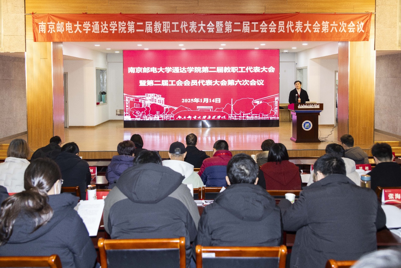 在两代会全体代表会议上,院长王国平作学院工作报告。报告从“坚持实施党建引领凝心聚力工程,抓党建、严作风,奋进通达建设扎实开展”“坚持实施人才培养质量培优工程,突重点、强特色,特色通达建设深入推进”“坚持实施生源就业质量提升工程,稳增长、促突破,品牌通达建设取得实效”“坚持实施内部治理提质增效工程,破难题、出实招,活力通达建设规范有序”“坚持实施校园建设文化浸润工程,办实事、提质量,魅力通达建设全面提升”等五个方面全面总结了2024年学院工作,并从抓好党的政治建设、大力推进思想政治工作、加强基层党组织建设、打造高素质干部队伍、深入推进全面从严治党、加强统战群团工作、强化师资队伍建设、推进专业与课程建设、提升创新创业教育能力、深化产学研融合、加强对外交流合作、优化学生教育管理、做好招生就业工作、优化内部治理、强化服务保障能力、提升校园文化内涵、建设平安美丽幸福校园等十七个方面展望了2025年学院工作。报告强调,新的一年,全院教职工要在学院党政的正确领导下,始终坚持立德树人根本任务和为党育人、为国育才的初心使命,按照学院提出的”党建为魂、质量为先、规范为矩、安全为要”的整体要求,锚定目标,凝心聚力、担当作为、实干笃行,再创通达学院各项事业新的辉煌。