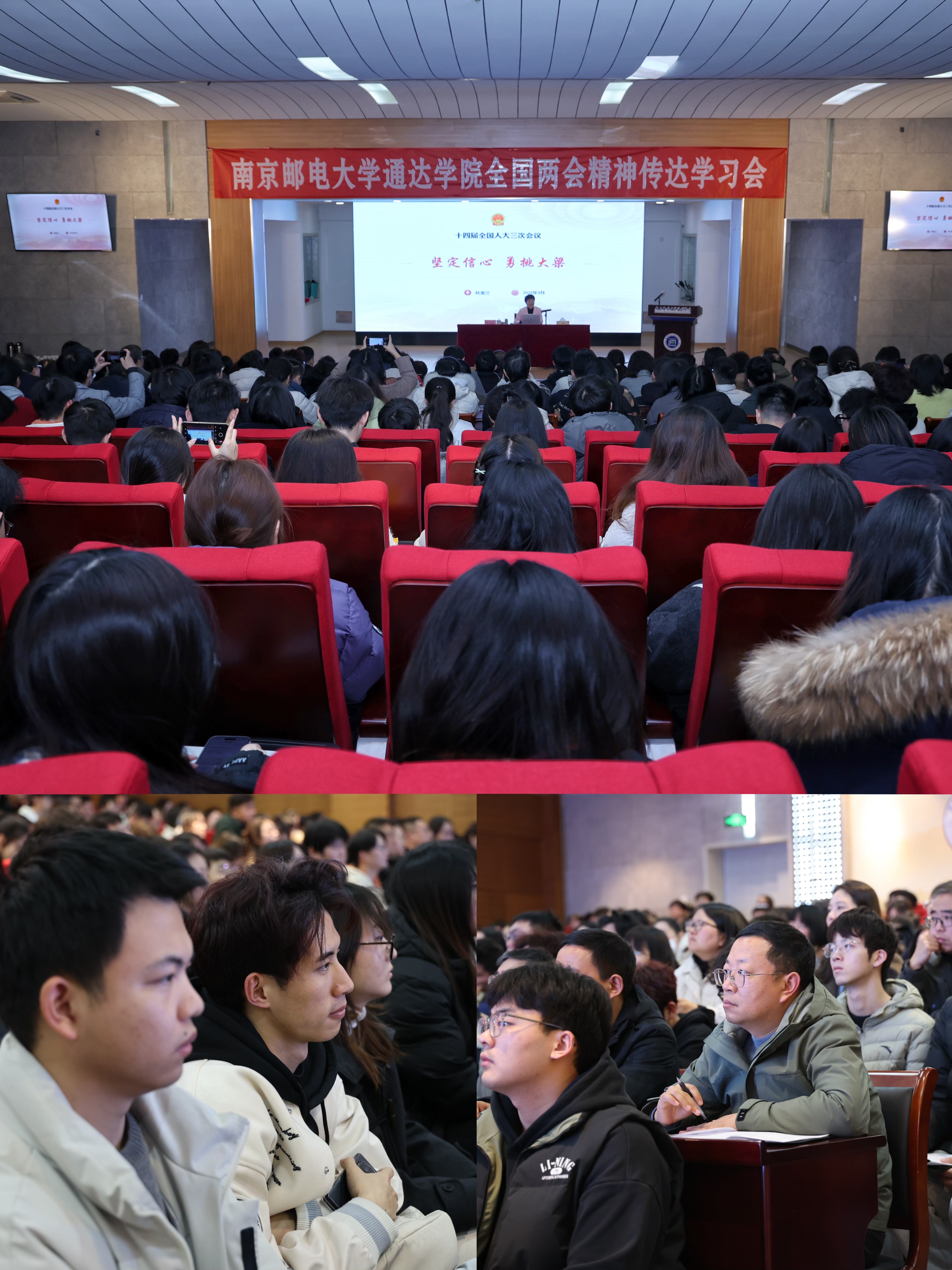 叶美兰校长以“坚定信心 勇挑大梁”为题,从“十四届全国人大三次会议概况”“习近平总书记在大会期间的重要讲话精神”“全国人大常委会、‘一府两院’工作报告”“全国人民代表大会和地方各级人民代表大会代表法修改情况”“江苏省代表团主要活动和审议情况”等五个方面,结合自身参会的所见所闻所思,以生动案例,全面系统、深入浅出地传达会议内容,深度阐释会议精神,赢得现场师生阵阵掌声。