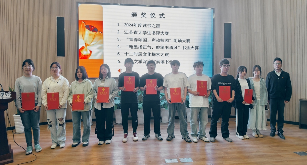 诗意朗诵,榜样领航。四名读者代表带来的诗朗诵《一路书香,一生阳光》将开幕式推向高潮。朗诵者们或激昂慷慨、或婉转低回,用优美的诗句传达出对知识的敬畏和对美好生活的向往,展现了中华文化中的读书情怀。随后,张伟副院长为2024年度“读书之星”及江苏省大学生书评、朗诵、书法、文化探索之旅、深度探索读书会中脱颖而出的获奖者颁发证书与奖品。