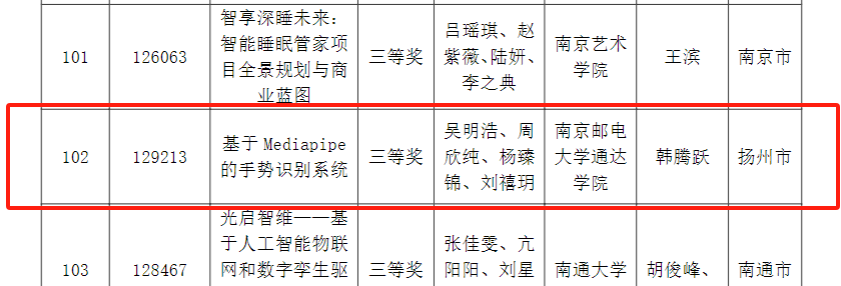 本届大赛以“人机协作”命题,共吸引全省64所高校参赛,复赛项目总计166项。经过初审、作品陈述、评委问辩环节,由完美官网吴明浩、周欣纯、杨臻锦、刘禧玥四名同学共同参与,韩腾跃老师指导的作品《基于Mediapipe的手势识别系统》荣获大学组“三等奖”。