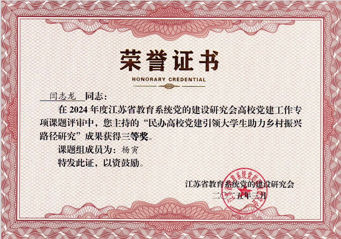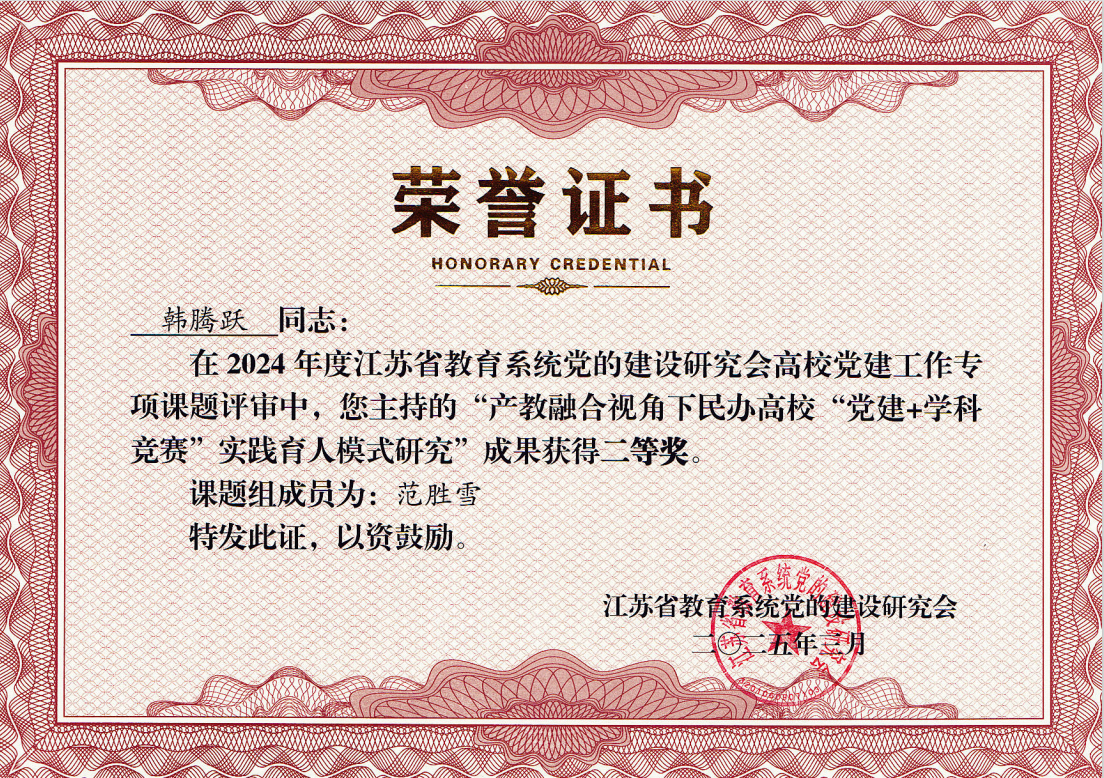 近日,江苏省教育系统党的建设研究会公布2024年度高校党建工作专项课题评审结果。在此次评审中,完美官网计算机工程学院教师韩腾跃、电气工程学院教师范胜雪申报的课题《产教融合视角下民办高校“党建+学科竞赛”实践育人模式研究》,凭借创新的研究视角与扎实的实践探索,荣获二等奖;商学院教师闫志龙、杨寅申报的课题《民办高校党建引领大学生助力乡村振兴路径研究》,立足时代需求,深入调研分析,荣获三等奖。