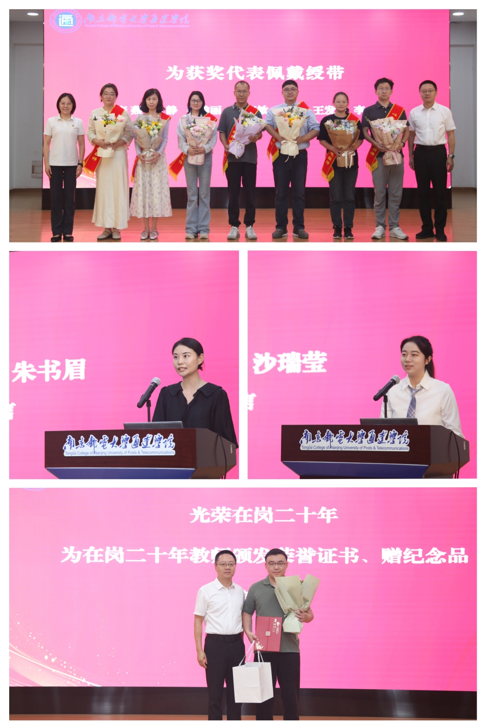 榜样宣传,表彰鼓励。大会对2024-2025学年在人才项目、学科竞赛指导等方面的先进典型予以表彰,常务副院长杨立军宣读了本次教师节庆祝大会表彰名单,党委书记赵允玉、院长沈建华为受表彰教师代表佩戴绶带,献上鲜花,向他们表示最诚挚的祝贺和崇高的敬意!