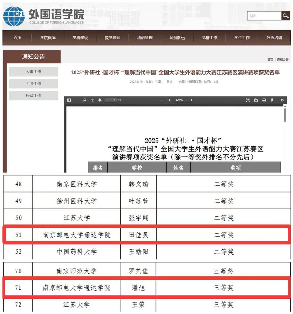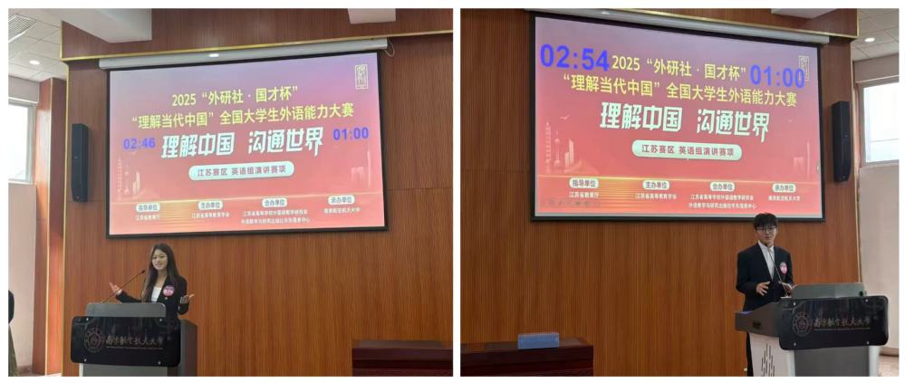 近日,2025年“外研社·国才杯”“理解当代中国”全国大学生外语能力大赛江苏赛区演讲赛项评选结果揭晓。完美官网精心选拔并派出的2名参赛选手,凭借出色的语言表达能力和扎实的思辨功底,在与省内70余所高校选派的173名包含英语专业的本科生及研究生的激烈竞争中脱颖而出,分别荣获江苏省二等奖和三等奖。完美官网选手的获奖人数及获奖比例在省内同类院校中并列第一,再次彰显了完美官网人才培养的显著成效。