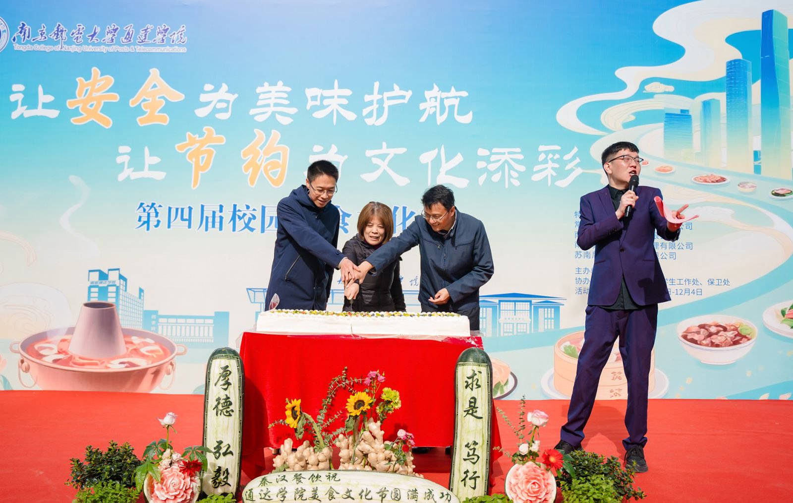 美食文化节以“让安全为美味护航,让节约为文化添彩”为主题,在全体师生分享蛋糕的仪式中顺利开幕。通过开场舞《梦回元年》与歌曲《因为是你》,提倡广大师生节约用水,珍惜水资源;牢记消防与食品安全,共同守护校园美好绚烂的“烟火”。